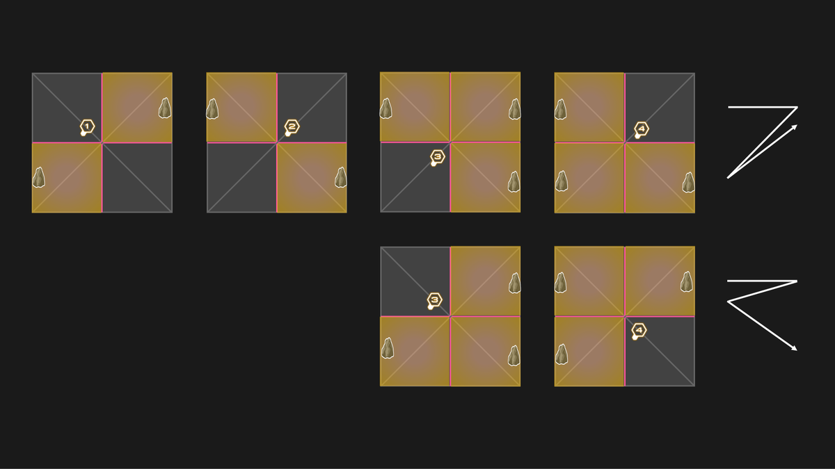 外側4マスは遠隔が時計回りに1←H2D4/H1D3→4