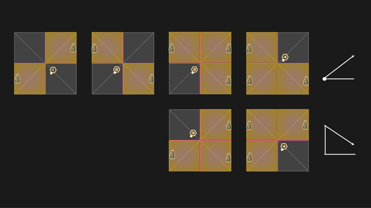 左上安置スタートが2パターン、それと鏡合わせの右上安置スタートが2パターンあります。